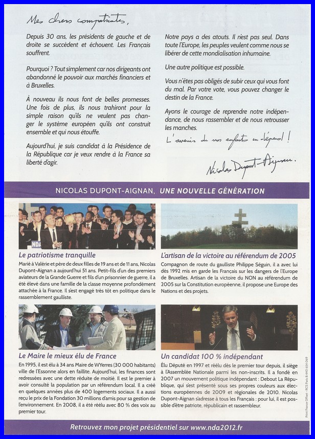 Bureaudevote.fr vous propose de découvrir la profession de foi de Nicolas Dupont-Aignan, candidat de Debout La République à l'élection présidentielle 2012.