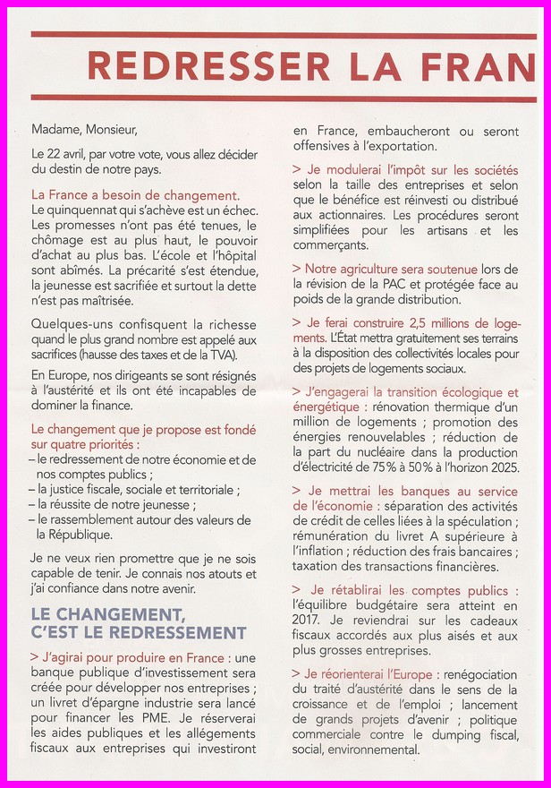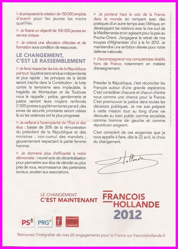 Bureaudevote.fr vous propose de découvrir la profession de foi de François Hollande, candidat du Parti Socialiste à l'élection présidentielle 2012.