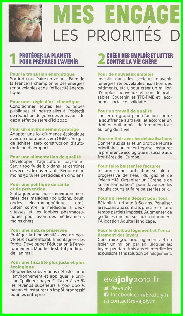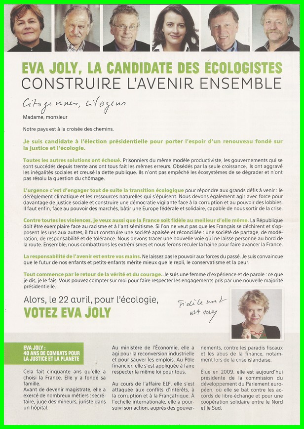 Bureaudevote.fr vous propose de découvrir la profession de foi de Eva Joly, candidate de Europe Écologie Les Verts à l'élection présidentielle 2012.